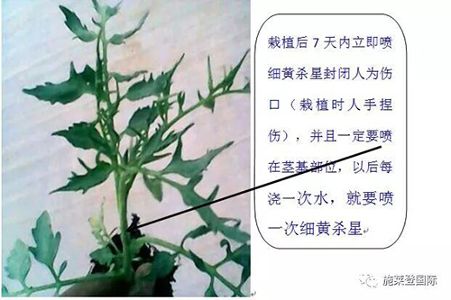 1、在栽植前用“细黄杀星”蘸根,同样是封闭根的伤口,切断细菌从根系伤口侵染的途径,对维管束病害“青枯病”、“枯萎病”从源头根除。
